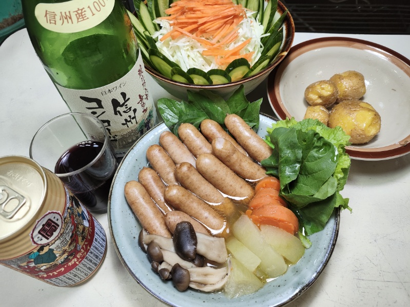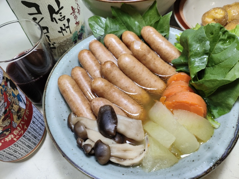 夕飯はソーセージと冬瓜、野菜の中華スープ煮。