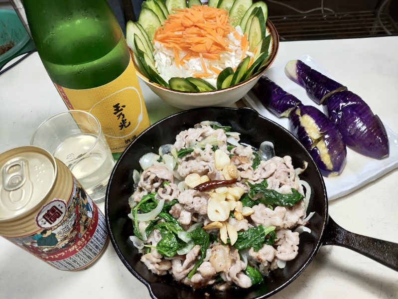 金曜日の夕飯は、豚肉とベビーリーフ、たまねぎの唐辛子ニンニク炒め。