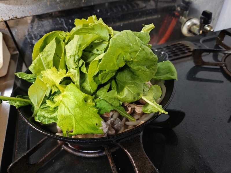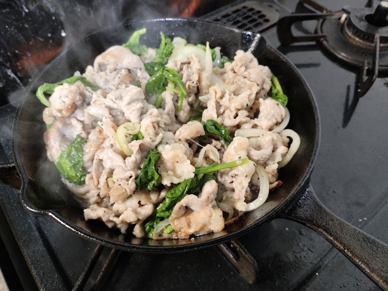 スキレットにて、にんにく、唐辛子で香り付けした油で、小麦粉をまぶした豚肉、たまねぎを炒めて、ベビーリーフを加えて塩コショウ、コリアンダーで味付け。
