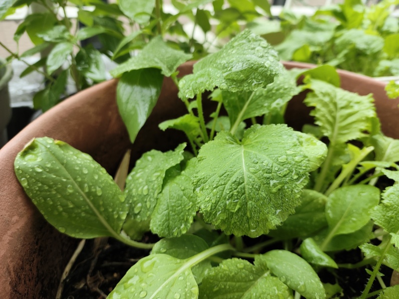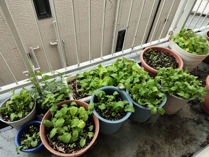 ベランダの鉢植え類はベビーリーフ、ルッコラとタイバジルと食べられる葉野菜ばかりにしてしまった。