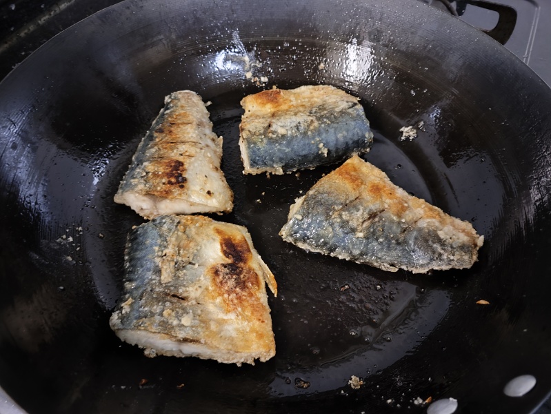 塩コショウ、コリアンダーで味付けした鯖に片栗粉をまぶして、ニンニクで香り付けした油で焼いて。