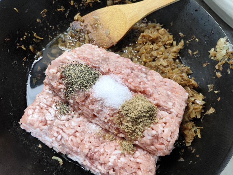 生玉ねぎをみじん切りにして炒めて、豚ひき肉、炒め玉ねぎ、塩コショウ、コリアンダー、水を混ぜてこねて成形して。
