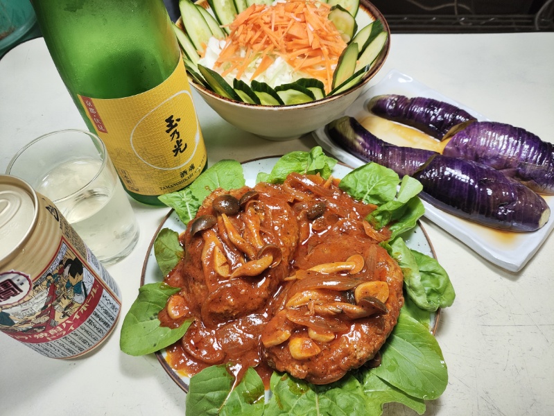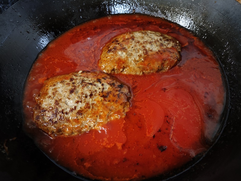 豚ひき肉と炒めた刻み玉ねぎを塩コショウ、コリアンダーと共に混ぜて成形して焼いて、トマトジュース、玉ねぎ、シメジを入れて煮絡めて塩コショウで味を整えて。