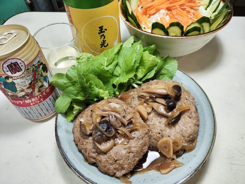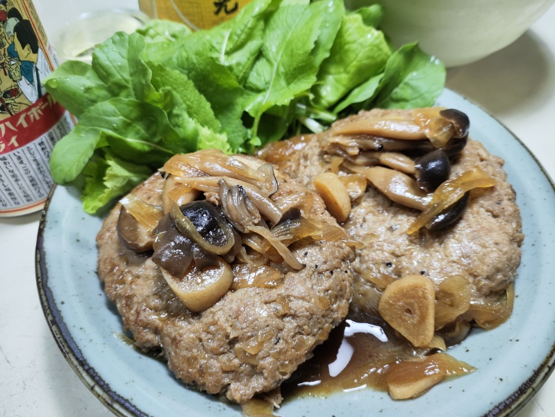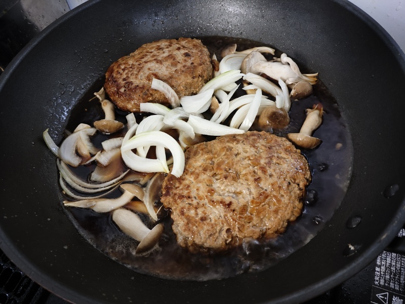 豚ひき肉と炒めた刻み玉ねぎを塩コショウ、コリアンダーと共に混ぜて成形して焼いて、醤油、酒、みりん、砂糖のタレと玉ねぎ、シメジを入れて煮絡めて。