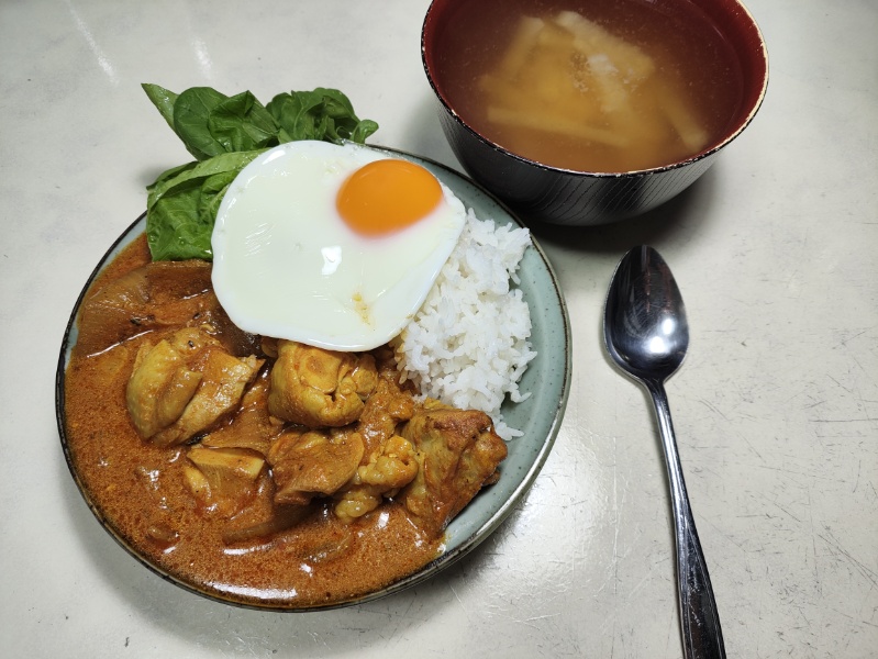 朝ごはんはヨーグルトとトマトジュースのチキンカレー。