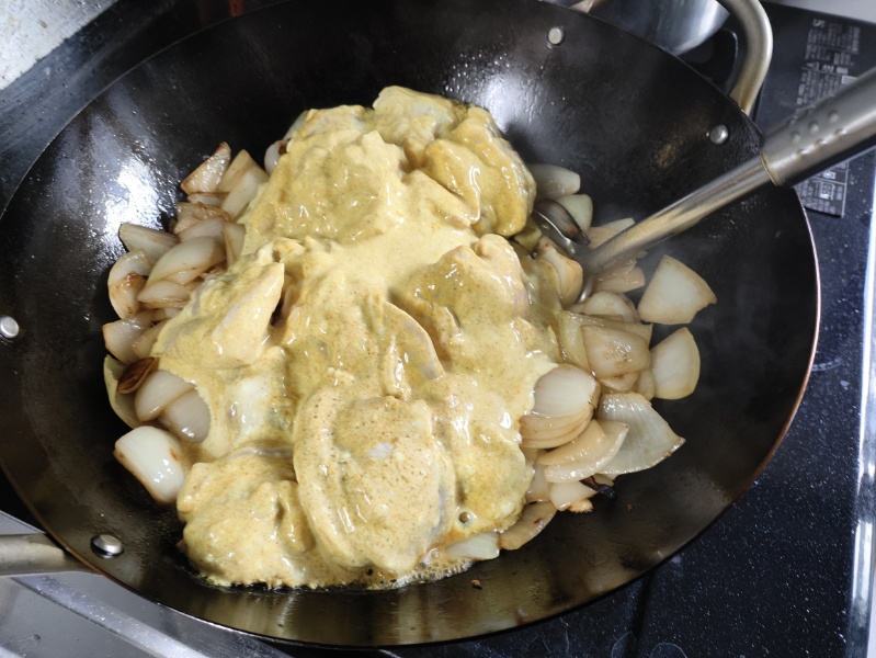コンソメスープの素、オイスターソースで味を調えて、ターメリック、クミン、コリアンダー、そしてカレー粉を加えて。