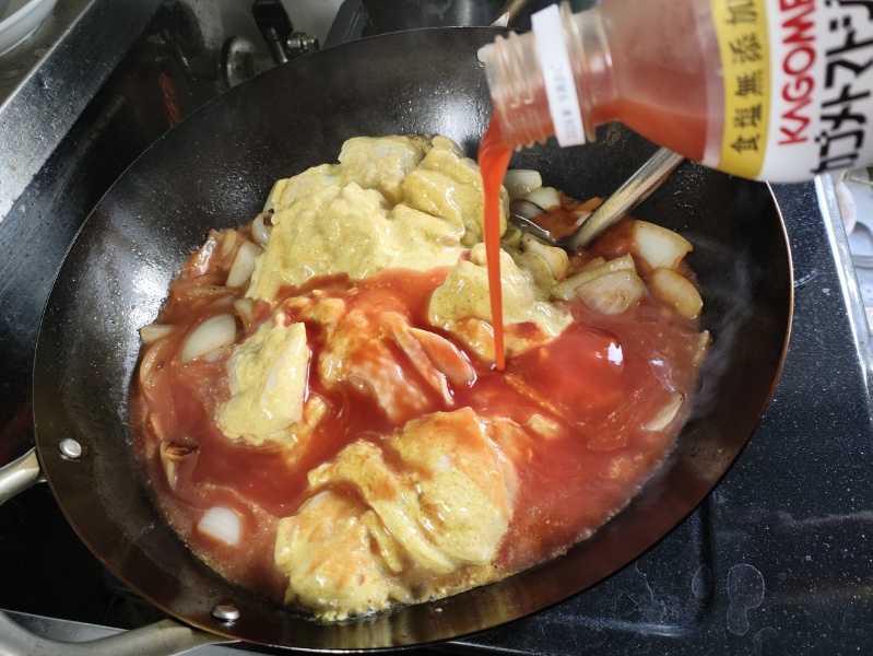 ニンニク、玉ねぎを炒めて漬け込んだ鶏もも肉とヨーグルトを加え、トマトジュースを加えて煮込んで。