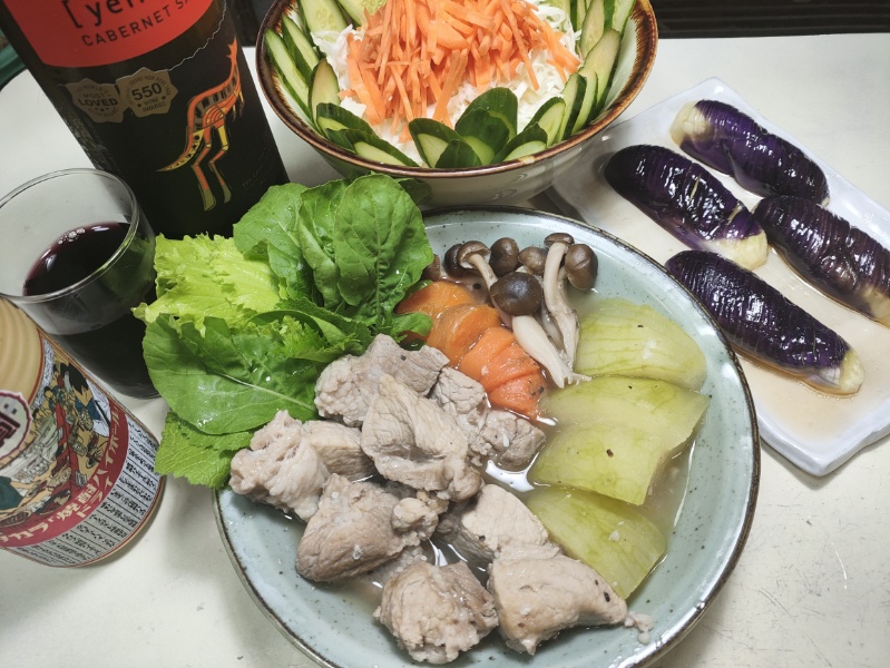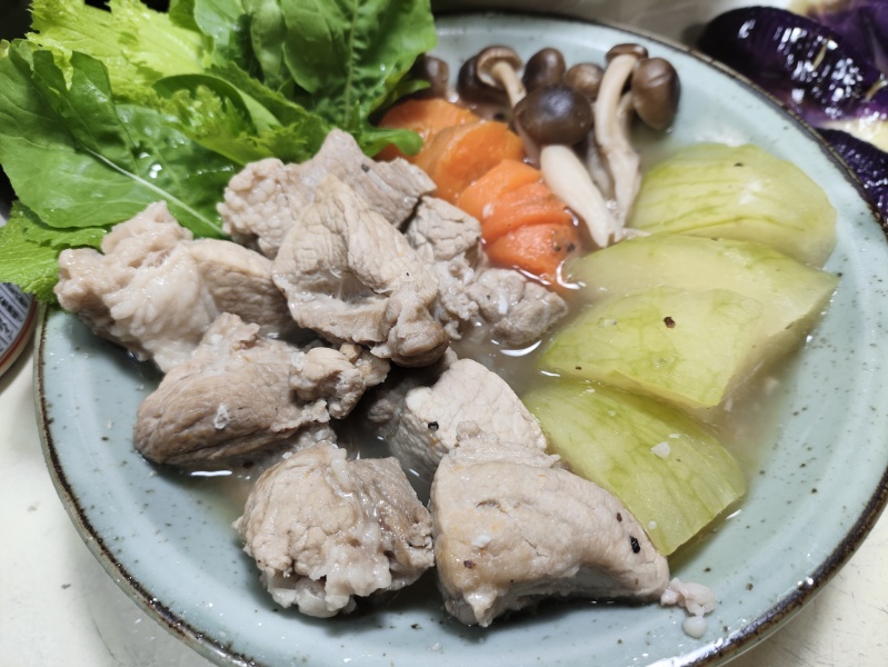 夕飯は、豚肉と野菜の中華風スープ煮。