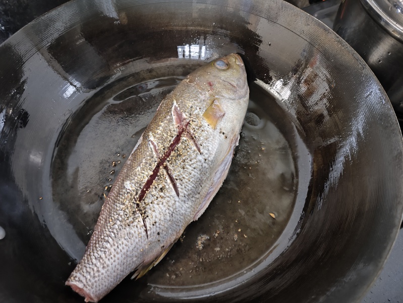 鱗を取り腹をさばいたイサキに、塩コショウしてニンニクで香り付けした油でソテーして、ベビーリーフと共に盛り付けて。