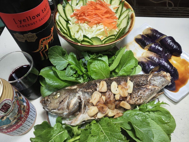 飲み物はサッポロビールのオーストラリアワイン、イエローテイルのカベルネ・ソーヴィニヨン。