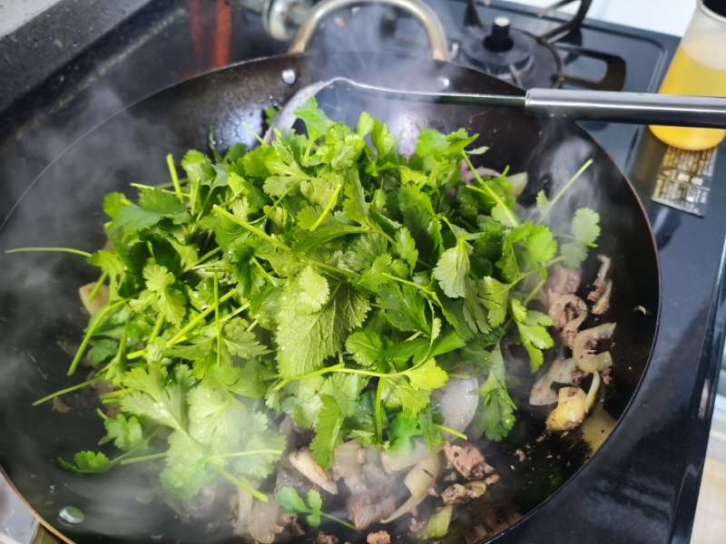 一口大に切ったマグロの血合いをニンニク、生姜、玉ねぎと共に炒めて、塩コショウで味付けして、パクチーを混ぜ入れて。