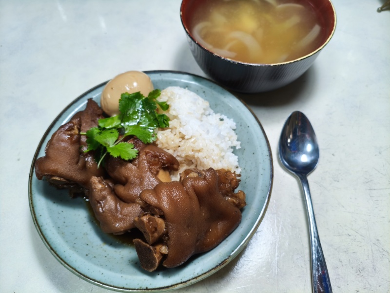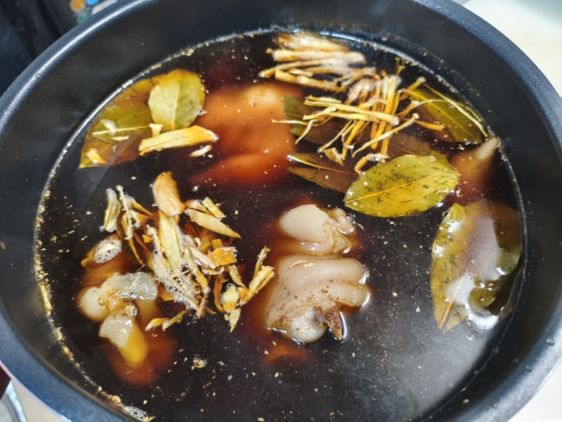 豚足は水洗いして、醤油、酒、みりん、砂糖、ローリエ、生姜、五香粉の煮汁で1時間半煮込んで。
