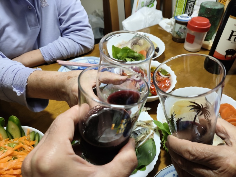 実家帰省 投稿日時: 2025年10月18日 投稿者: blog3rd 本日、実家帰省にて。 両親と共に。飲むのはチリワインで。 作ってきたのはブリカマと野菜の中華スープ煮。そしてイワシの素揚げ。 ブリカマが大きいかと思ったが、食べてしまった。