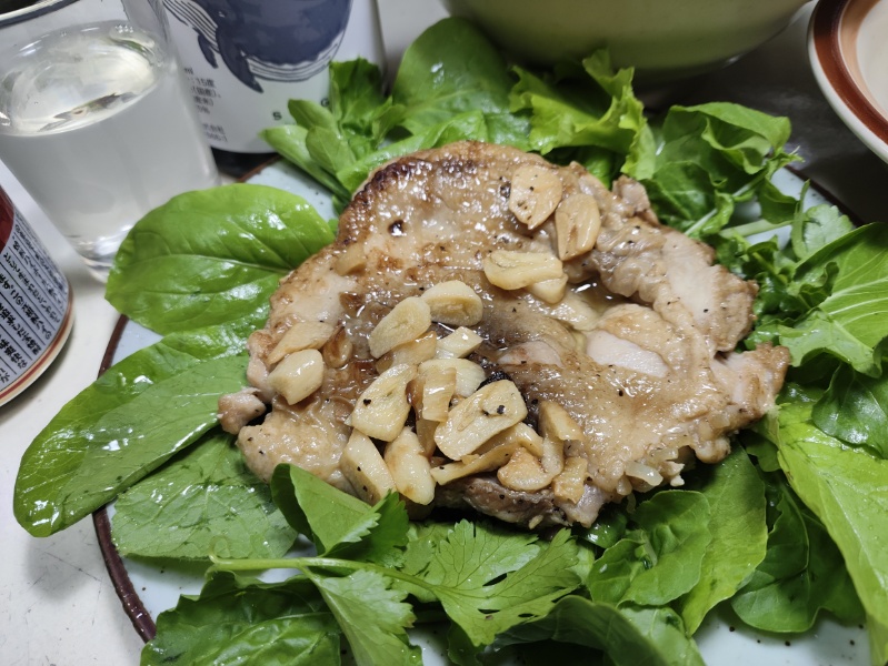 切れ目を入れた鶏もも肉を塩コショウして、ニンニクで香り付けした油でじっくり焼いて。