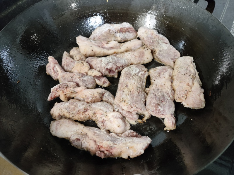 スライスした豚肉に塩コショウして、小麦粉をまぶしてニンニク、唐辛子で香り付けした油で焼いて。