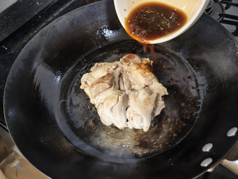 鶏もも肉を弱火でじっくり両面を焼いて、醤油、酒、みりん、砂糖、生姜のタレを入れたら煮絡めて。