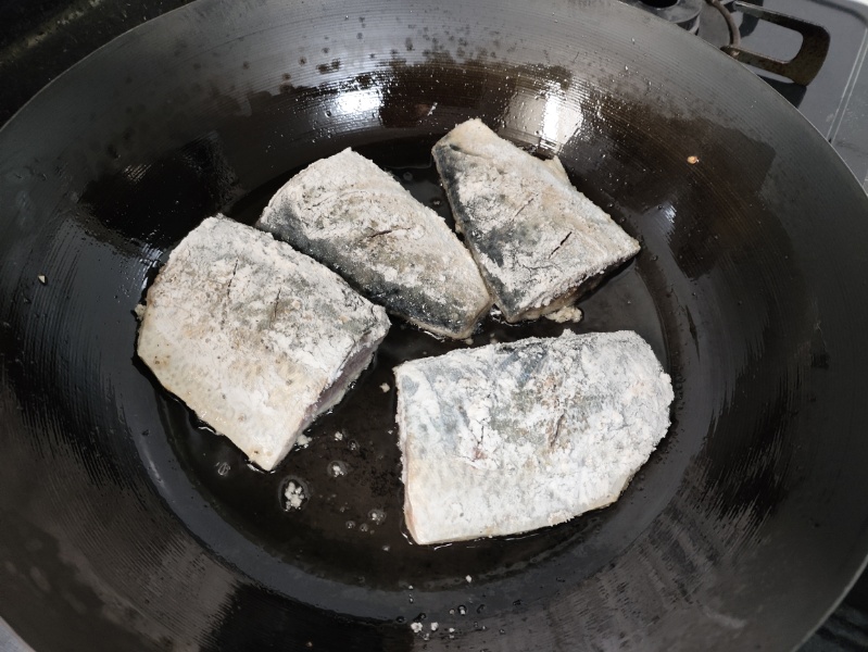 塩コショウで味付けした鯖に片栗粉をまぶして、ニンニク、唐辛子で香り付けした油で焼いて、ベビーリーフ、パクチー、ルッコラと盛り付けて。