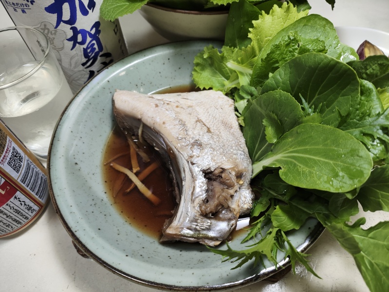 ブリカマを醤油、酒、みりん、砂糖、生姜の煮汁で煮付けて。