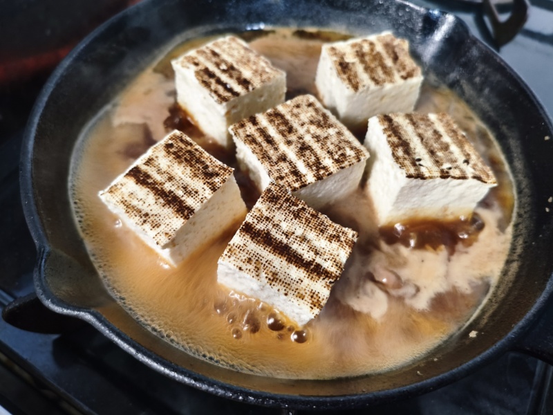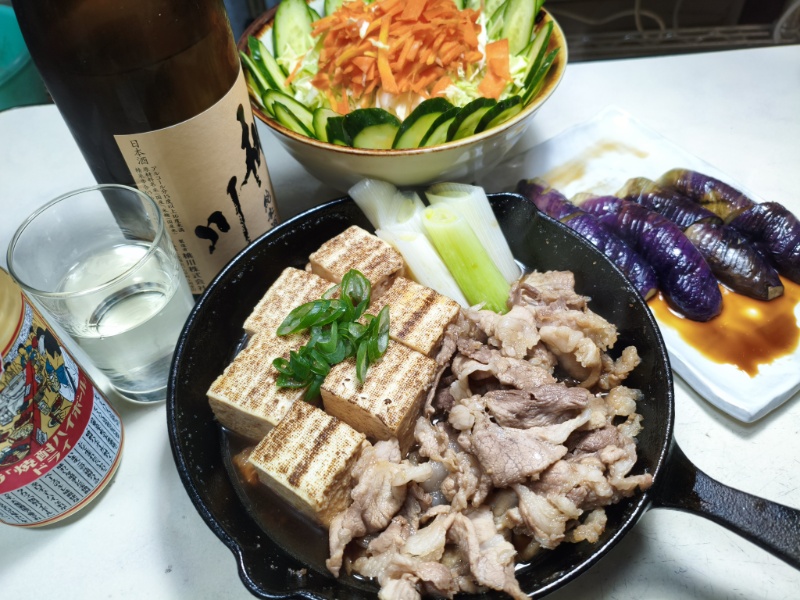 醤油、砂糖、みりん、酒、生姜の煮汁で豚こま肉を煮たら一度取り出し、焼き豆腐を煮たら豚肉を戻して温め直して、レンチンした長ネギと共に盛り付けて。