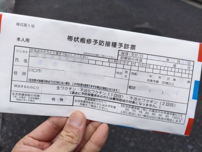 帯状疱疹ワクチンのうち、2回接種する不活化ワクチンの1回目、接種完了。