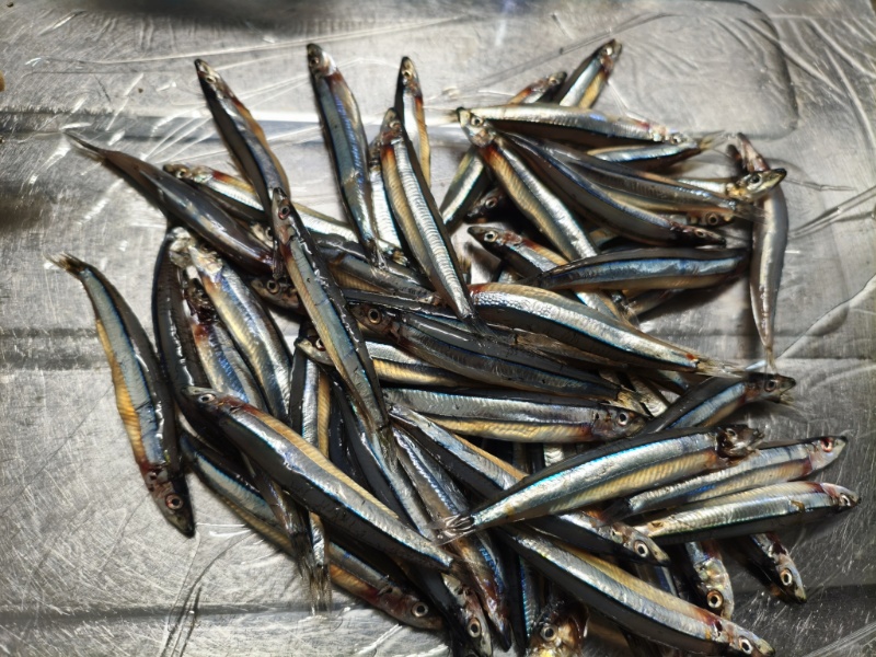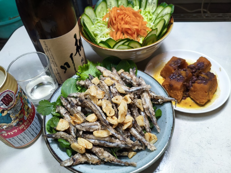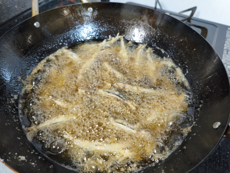 キビナゴに塩コショウ、コリアンダーを振って片栗粉をまぶし、弱火の油でじっくり揚げて。